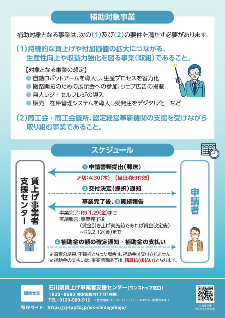 石川県では賃上げを実施する企業が持続的な賃上げと成長を実現できるよう企業の「稼ぐ力」の強化(生産性向上・収益力強化)を図る取組を支援します。