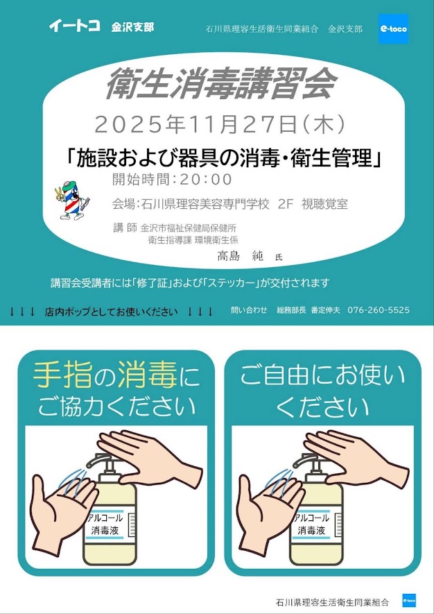 「令和7年度 金沢支部衛生消毒講習会」のお知らせ