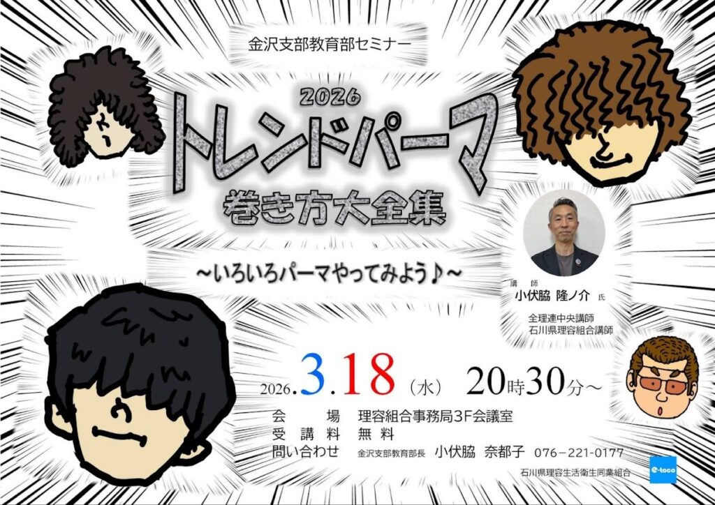 2026年2月18日 / 最終更新日 : 2026年2月18日 irk 運営委員 講習情報 「2026 トレンドパーマ 巻き方大全集」(金沢支部教育部セミナー)開催のお知らせ 下記の日程にて「2026 トレンドパーマ 巻き方大全集」(金沢支部教育部セミナー)を開催します。 是非、お誘い合わせの上、ご参加下さい。 日時: 令和8年3月18日(水)午後8時30分より 会場: 理容組合事務局 3F 会議室 ※ 駐車場は 事務局前のほか、理美容学校の駐車場も利用できます 講師: 小伏脇 隆ノ介 氏(全理連中央講師・石川県組合講師) 参加費: 無料 お問い合せ: 小伏脇 奈都子( 金沢支部教育部長)076-221-0177 シェアするツイートする更新情報を Push 通知で受けとるTwitter で Follow Mr_Pole